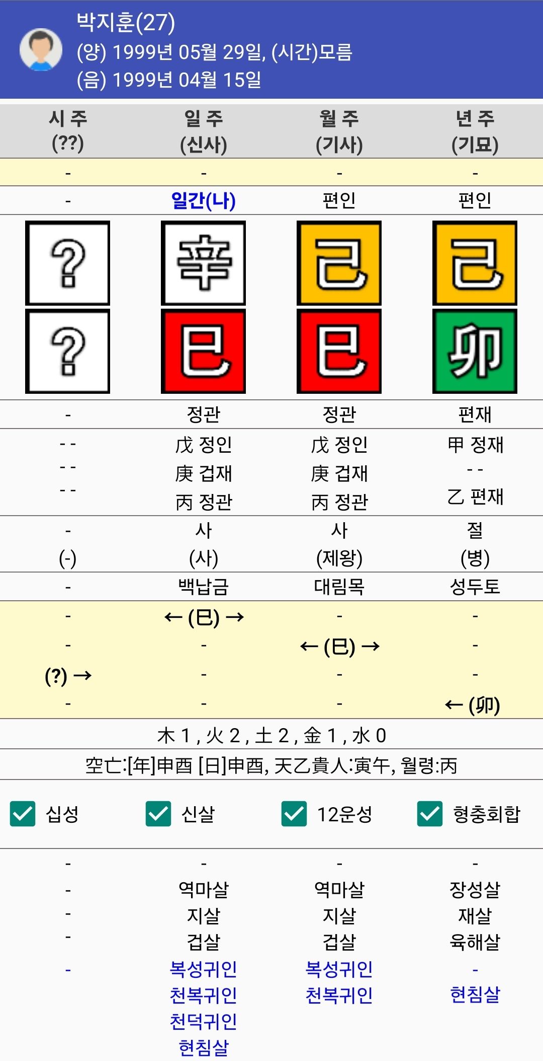 지지에 격각이 있기는 하지만 나머지 큰 흉살이나 천라지망, 원진귀문, 형, 충, 합도 안 보이고 아주 깔끔 그 자체입니다. 겁재가 암장되어 있어서 승부욕도 있는 편이며 지는 것을 매우 싫어하게 되고요~ 인성이 세력을 받게되므로 자격, 문서, 이권, 저작물 운도 있습니다.