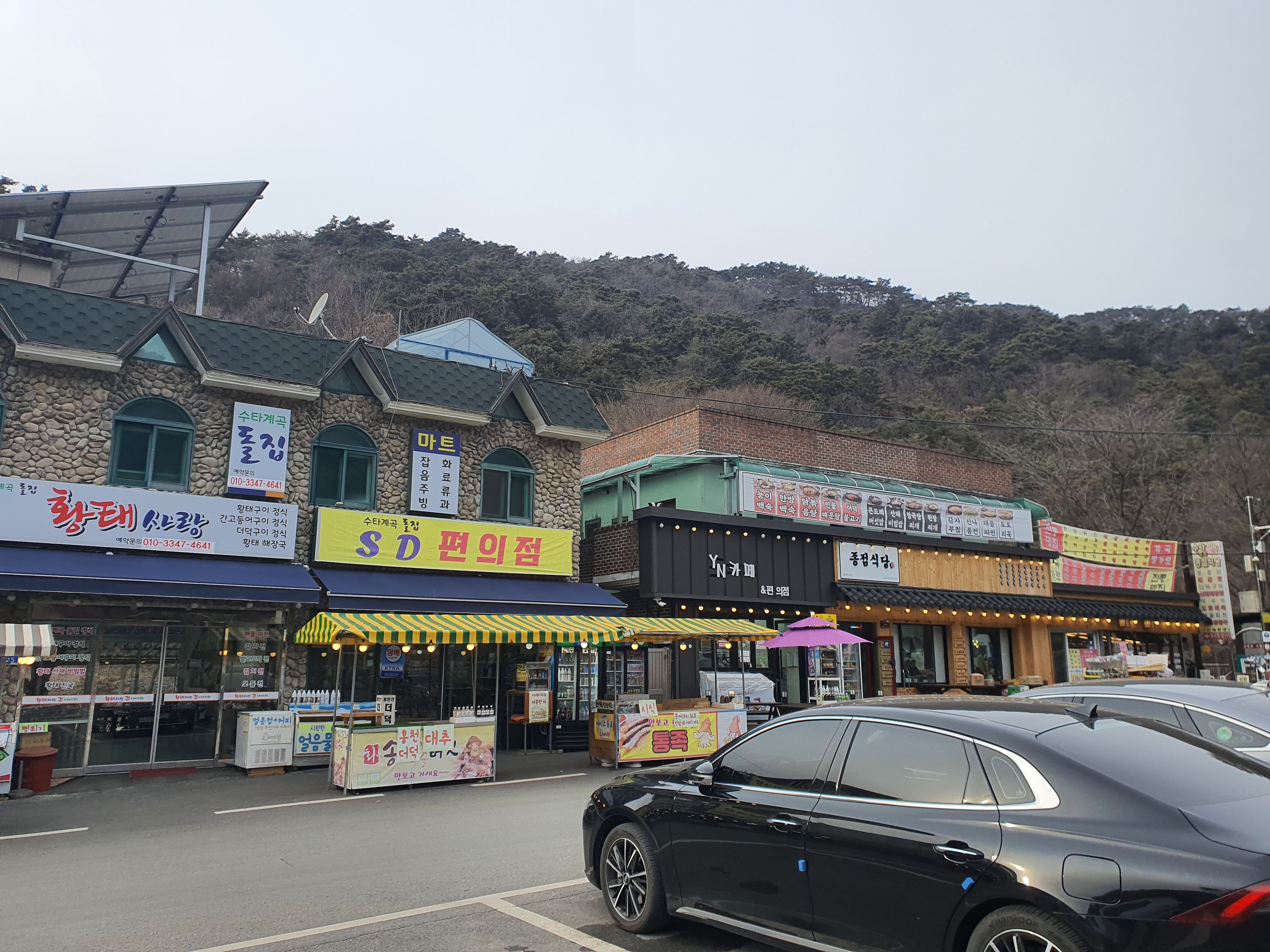 수타사 입구에는 카페, 식당이 줄지어 있습니다